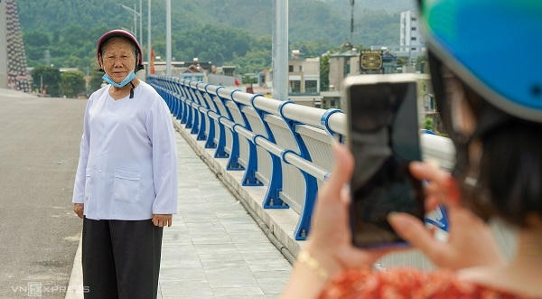 Hai ngày sau khi cầu Hòa Bình 2 cho phép người dân đi lại, bà Đỗ Thị Hoàn (80 tuổi, phường Đồng Tiến) được con gái chở ra chụp ảnh kỷ niệm.