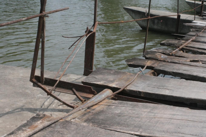 Cầu dài chừng 100m, rộng hơn 1m là những mảnh gỗ chắp ghép lại. Ở thời điểm hiện tại, có những mảnh đã có dấu hiệu xuống cấp, các đầu mối bằng sắt cũng nhìn rõ những mối hở… Trụ đỡ là những chiếc thuyền được làm bằng bê tông rêu đã bắt đầu phủ.
