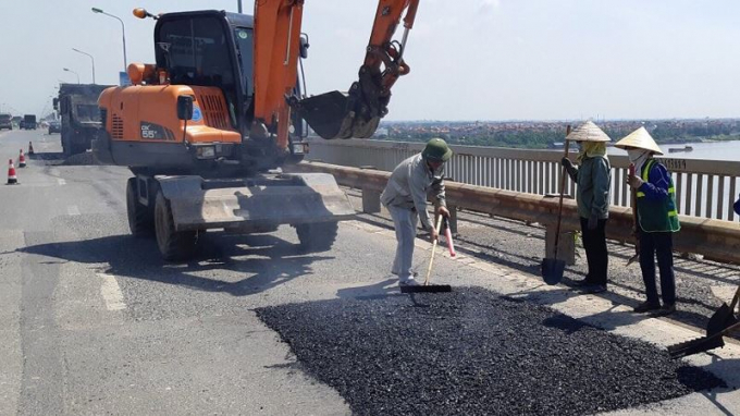 Mặt cầu Thăng Long được cào bóc và trám vá tạm thời để đảm bảo lưu thông