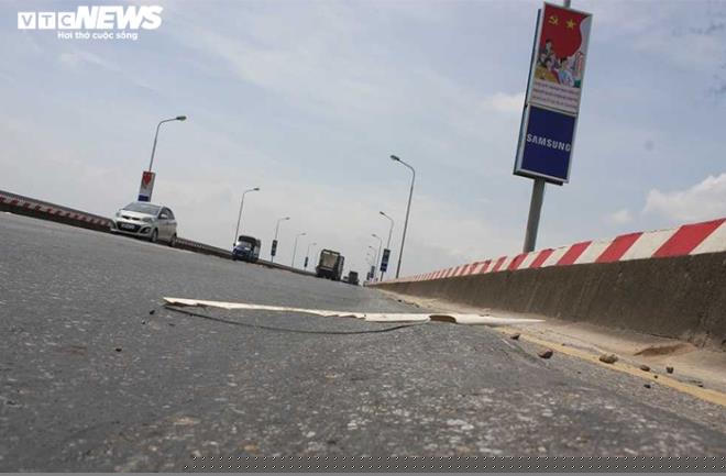 Nhiều lần tu sửa, cây cầu nằm trên "trục đường ngoại giao" của Hà Nội vẫn xuất hiện nhiều ổ gà, ụ nhựa đường. (Ảnh: Tùng Lâm)