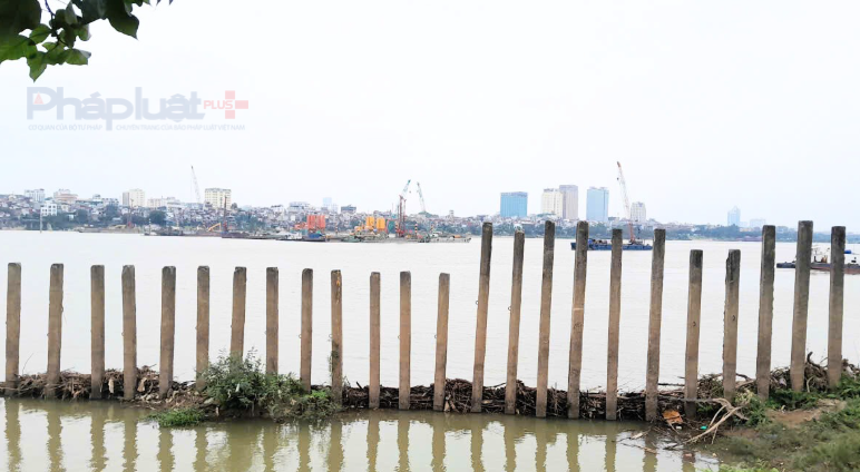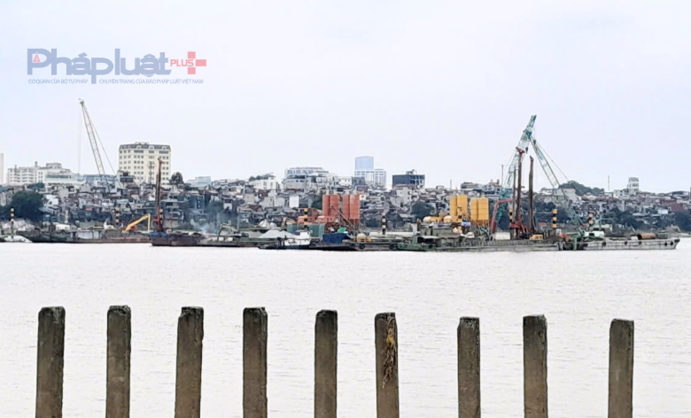 Sau gần 3 tháng thi công, dự án cầu Trần Hưng Đạo đang được đơn vị thi công triển khai khoan cọc nhồi để tiến hành làm các trụ móng cầu giữa sông Hồng.