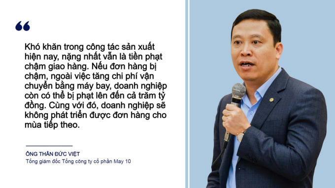 Khó khăn trong công tác sản xuất hiện nay, nặng nhất vẫn là tiền phạt chậm giao hàng. Nếu đơn hàng bị chậm, ngoài việc tăng chi phí vận chuyển bằng máy bay, doanh nghiệp còn có thể bị phạt lên đến cả trăm tỷ đồng. Cùng với đó, doanh nghiệp sẽ không phát triển được đơn hàng cho mùa tiếp theo.