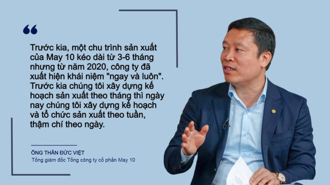 Trước kia, một chu trình sản xuất của May 10 kéo dài từ 3-6 tháng nhưng từ năm 2020, Tổng công ty đã xuất hiện khái niệm "ngay và luôn". Trước kia chúng tôi xây dựng kế hoạch sản xuất theo tháng thì ngày nay chúng tôi xây dựng kế hoạch và tổ chức sản xuất theo tuần, thậm chí theo ngày.