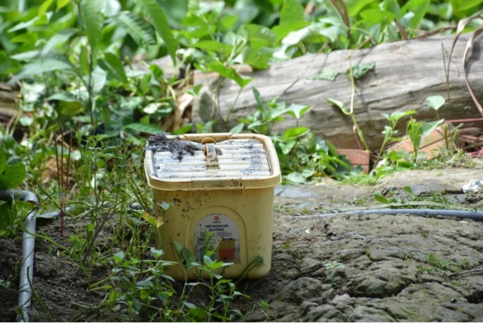 Chiếc thùng nhựa, nơi phát hiện cháu bé 14 ngày tuổi tử vong.