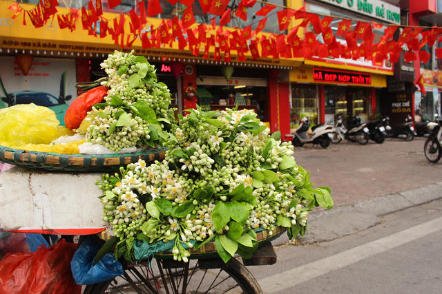 Những chùm hoa bưởi nhỏ xinh, có đủ hoa và nụ được xếp ngay ngắn trên những chiếc xảo tre đặt sau xe đạp ở khắp các con phố gợi nhớ mùa xuân, báo hiệu tháng 3 sắp về.