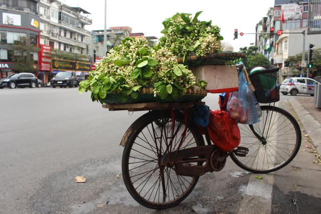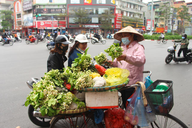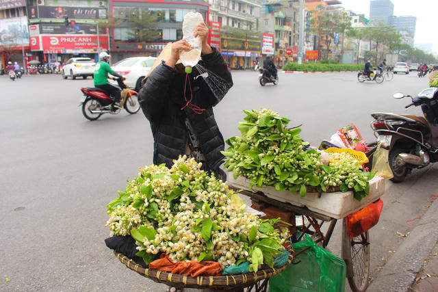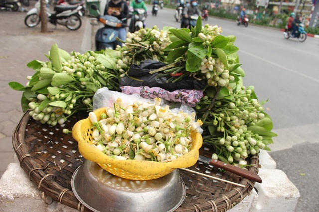 Trên các tuyến phố Xã Đàn, Lê Duẩn, Tôn Đức Thắng… đã phủ đầy màu trắng tinh khôi của những gánh hoa bưởi rong đầu mùa. Giá hoa bưởi dao động từ 25.000 - 35.000 đồng/lạng, tùy thuộc vào thời điểm bán cũng như chất lượng hoa.