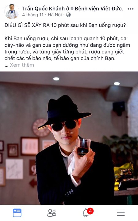 | Khánh thường xuyên chia sẻ, tâm sự về những tác hại ảnh hưởng đến sức khỏe mọi người. Mỗi Satus của chàng bác sĩ điển trai này luôn nhận được hàng ngàn lượt like, hàng trăm bình luận về sức khỏe... |