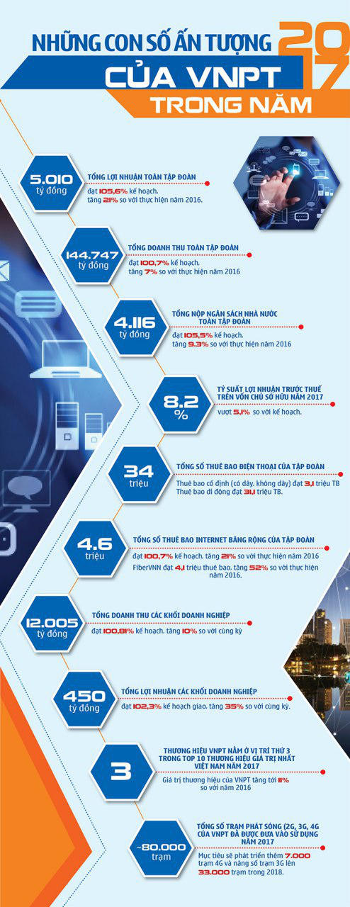 Với những nỗ lực đó, VNPT không chỉ nâng cao chất lượng dịch vụ cho khách hàng mà còn hoàn thành tốt nhiệm vụ phục vụ thông tin liên lạc cho nhiều sự kiện lớn của đất nước trong năm. Trong đó đặc biệt là việc đảm bảo thông tin liên lạc các sự kiện thuộc năm APEC 2017, được Lãnh đạo Đảng, Nhà nước và Bộ TT&TT đánh giá cao và khen thưởng.