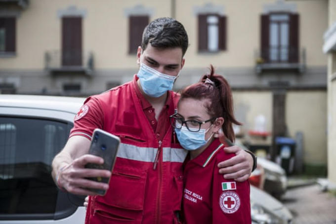 Nhân viên Hội Chữ thập đỏ chụp ảnh tự sướng tại trụ sở Hội Chữ thập đỏ ở Torino Ảnh: Stefano Guidi / Getty Images