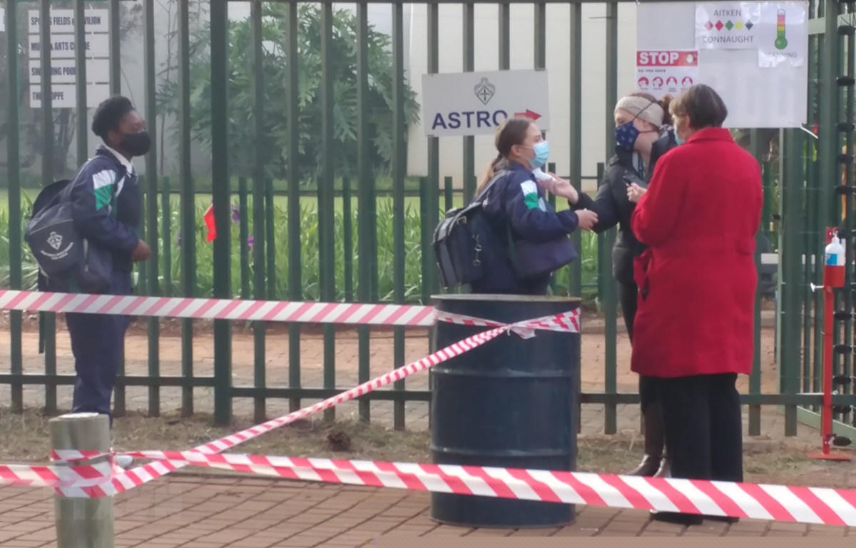Kiểm tra thân nhiệt cho học sinh trước khi vào lớp tại Trường trung học nữ sinh Pretoria, thủ đô Pretoria, Nam Phi. (Ảnh: Phi Hùng/TTXVN)