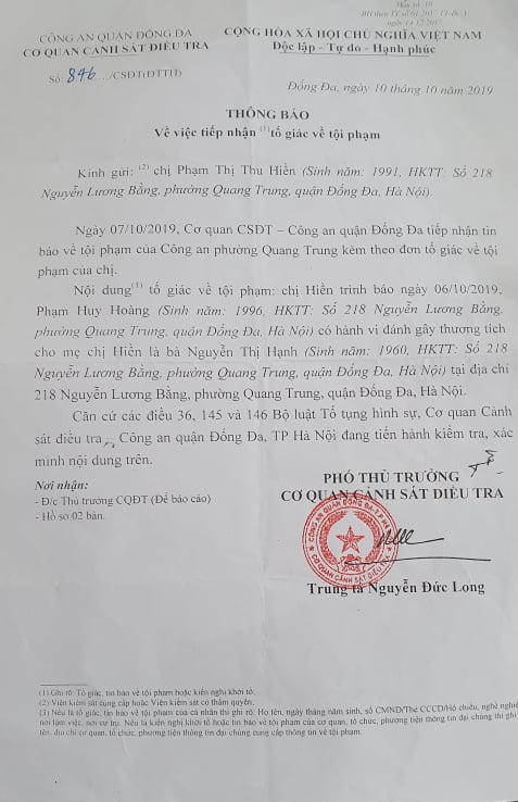 Trao đổi với phóng viên bà Hạnh nghẹn ngào trong uất ức: “Mặc dù tôi và gia đình đã trình báo và có đề nghị đại diện của Công an quận Đống Đa xác minh, làm rõ sự việc, tránh việc bỏ lọt tội phạm và đảm bảo sự công minh của pháp luật, thế nhưng, đến nay, gần 1 năm trời tôi cũng như gia đình chưa nhận được bất kỳ một một câu trả lời từ phía Công an quận Đống Đa.
