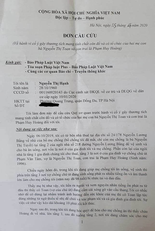 Nói về nguyên nhân dẫn đến sự việc bà Hạnh cho biết: “Ngày 06/10/2019, tôi có từ bên nhà thuê tại địa chỉ số 24/178 Nguyễn Lương Bằng về nhà của bố mẹ chồng (bố chồng tôi đã mất, chỉ còn mẹ chồng là bà Nguyễn Thị Tuyết) tại tầng 2 của ngôi nhà số 218 đường Nguyễn Lương Bằng để vệ sinh và cho bà ăn uống, nơi vốn là nơi ở của gia đình tôi và mẹ chồng.