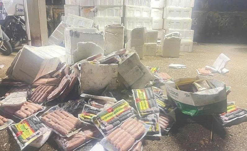 Kết quả kiểm tra cho thấy có tổng cộng 195 thùng xốp, mỗi thùng 20 gói xúc xích, tổng trọng lượng 2.730kg.