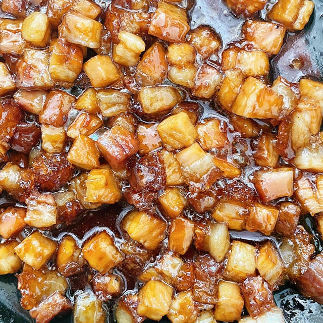 Thịt heo quay tẩm ướp gia vị rồi rim nhỏ lửa chính là yếu tố quyết định hương vị rất riêng của món chè này. Ảnh: Nguyễn Hoàng Bảo