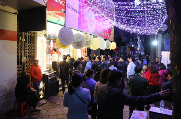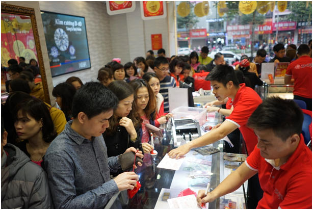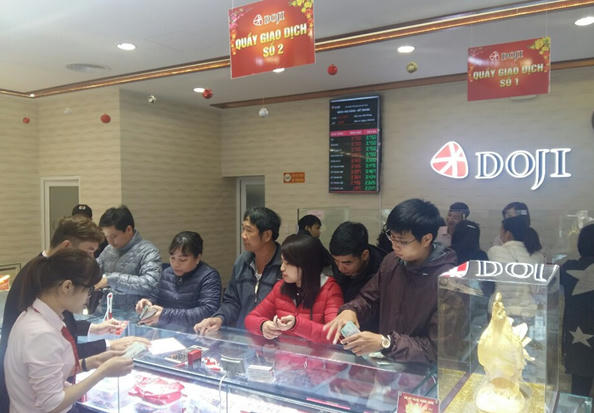 Mở cửa từ 6h30 sáng, các trung tâm và cửa hàng thuộc Tập đoàn DOJI đã được phủ kín bởi dòng người tấp nập đi mua vàng, nối dài trên những con phố kim tiền như Trần Nhân Tông (Hà Nội), Xã Đàn, phố Cầu Đất (Hải Phòng),…