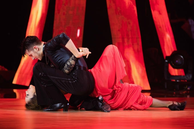 Trên sân khấu “Bước nhảy hoàn vũ”, Jennifer Phạm khiến giám khảo Chí Anh ngỡ ngàng vì quá mạnh mẽ và quyến rũ khi cô được ghép với dancer Nga, Maksim Elfimov trong bài Pasodoule.