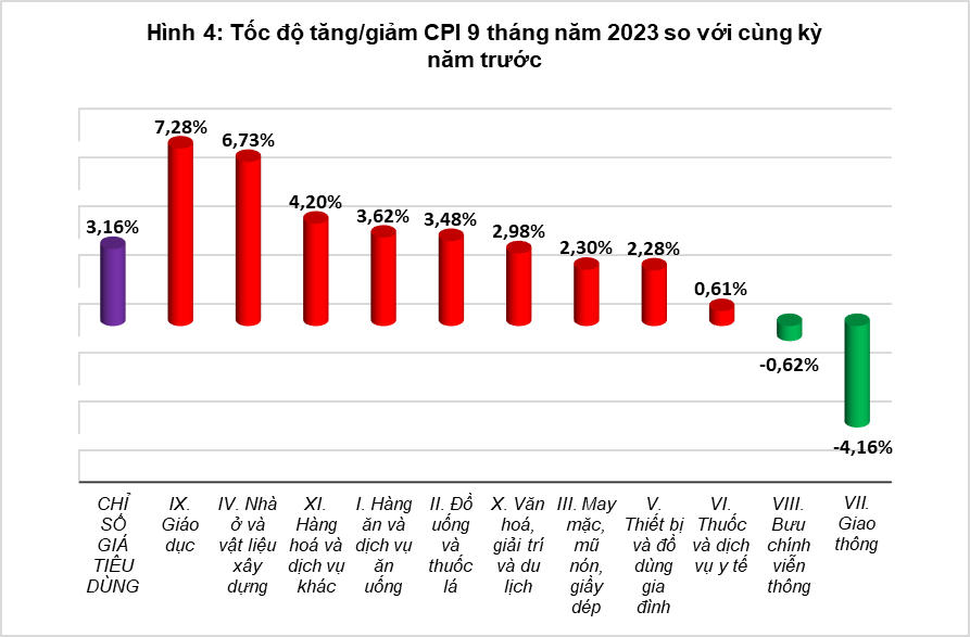 Nguyên nhân chủ yếu do bình quân giá xăng dầu trong nước 9 tháng năm 2023 giảm 15,26% so với cùng kỳ năm trước, giá dầu hỏa giảm 11,26%, giá gas giảm 10,21%. Đây là yếu tố kiềm chế tốc độ tăng của CPI nhưng thuộc nhóm hàng được loại trừ trong danh mục tính lạm phát cơ bản.