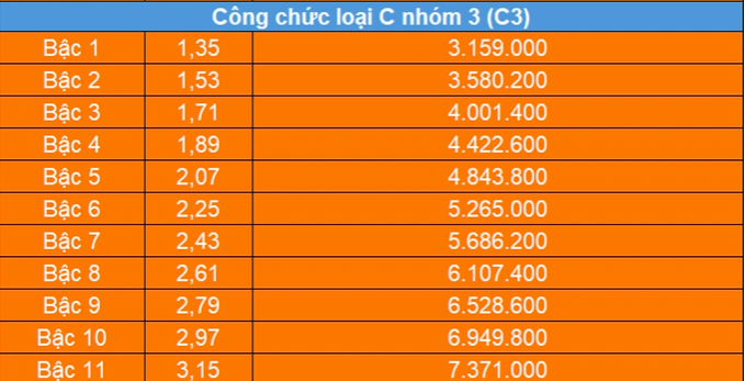 Theo đó, nhóm cán bộ, công chức loại C nhóm 3 (C3) bậc 1 sẽ có mức lương thấp nhất là 3.159.000 đồng/tháng (hệ số 1,35), cao hơn mức hiện hành 729.000 đồng/tháng.