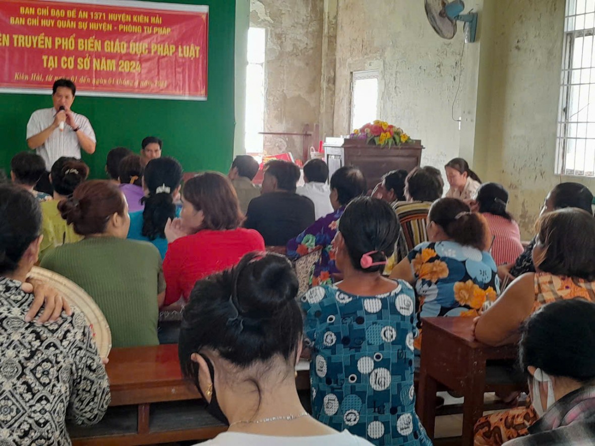 | Phòng Tư pháp và Ban chỉ huy quân sự huyện Kiên Hải trong một buổi tuyên truyền pháp luật ở cơ sở. |