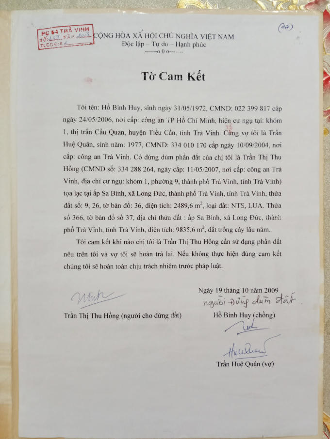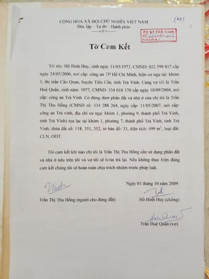 Bà Hồng trình bày, trong quá trình xác minh tin tố giác tội phạm của bà Hồng, Cơ quan CSĐT Công an tỉnh Trà Vinh đã tiến hành giám định tính xác thực của Tờ cam kết và xác định: chữ ký của người ghi là Hồ Bình Huy trong Tờ cam kết không phải chữ ký của ông Hồ Bình Huy (chồng cũ của bà Quân, hiện đã ly hôn). Vậy ai đã giả mạo chữ ký này thì cơ quan điều tra đã làm rõ và cũng không điều tra đến cùng sự việc.