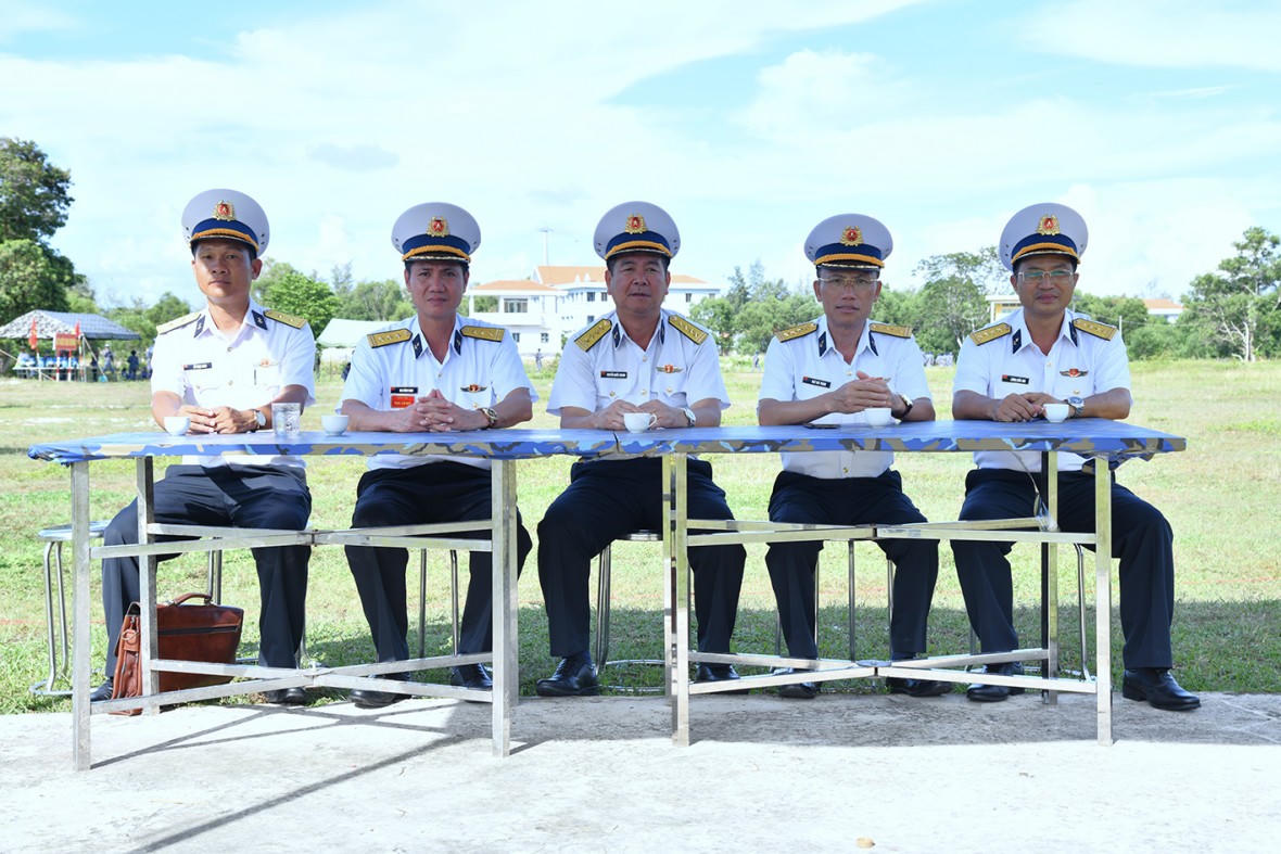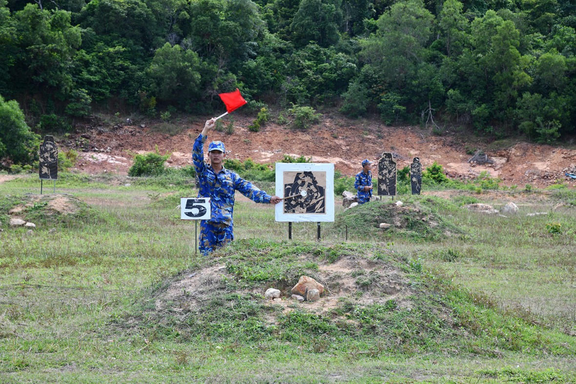 Đại tá Nguyễn Quốc Doanh - Phó Tham mưu trưởng Hải quân (ngồi giữa) và thủ trưởng Bộ Tư lệnh Vùng 5 Hải quân theo dõi chiến sĩ mới bắn đạn thật