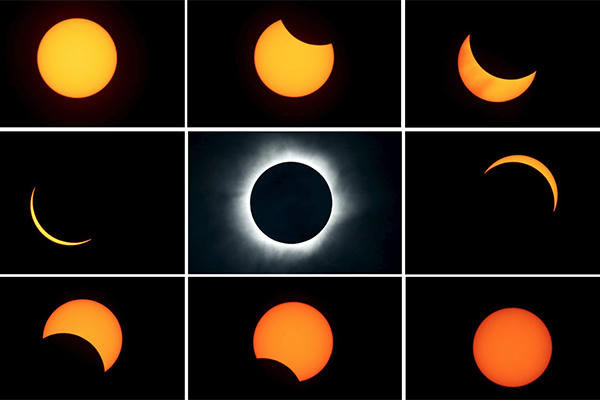 Các hình dạng của nhật thực khi quan sát từ Trái Đất. Lúc này, Mặt Trăng nằm ở vị trí che khuất một phần hoặc toàn bộ ánh sáng phát ra từ Mặt Trời.