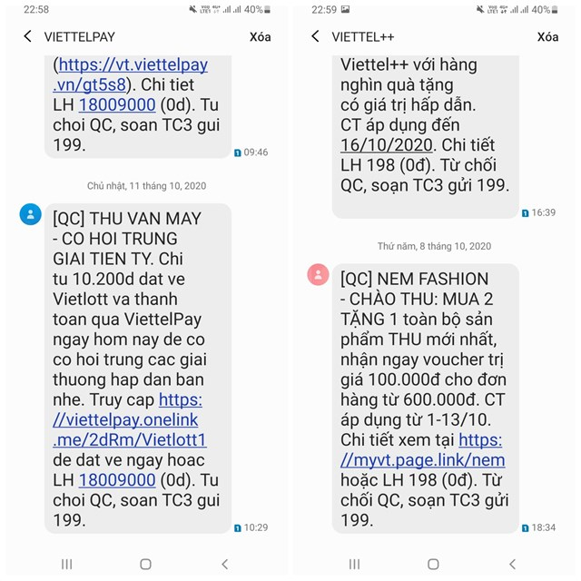 "Riêng từ đầu tháng 10 đến nay tôi nhận được 4 tin nhắn quảng cáo của Viettel Pay, 2 tin nhắn từ My Viettel, 2 tin nhắn từ Viettel++, một tin nhắn từ Mocha và một từ Viettel. Đó còn chưa kể hàng chục tin nhắn khác từ tháng 8, 9 mặc dù tôi đã nhắn tin từ chối nhận thông tin quảng cáo", chị Thi nói.
