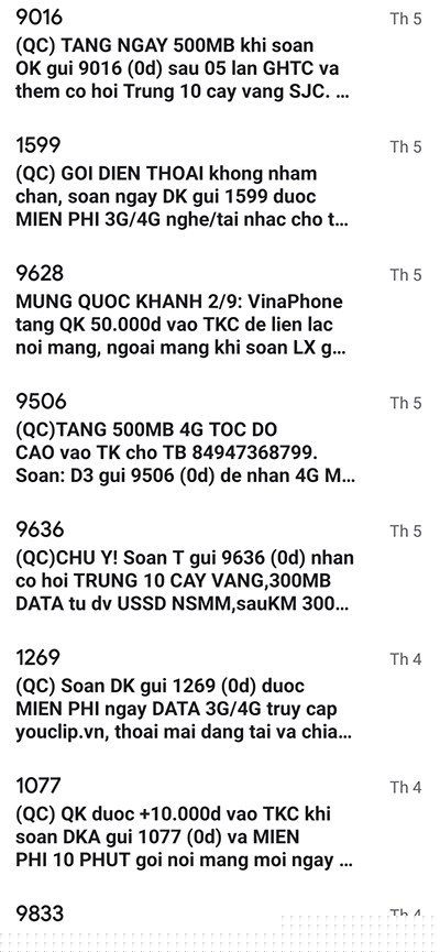 Tuy nhiên, chưa đầy 2 tuần sau đó, chị lại liên tục bị tấn công bởi những tin nhắn quảng cáo của doanh nghiệp viễn thông, với các đầu số quảng cáo từ rất nhiều đầu số.
