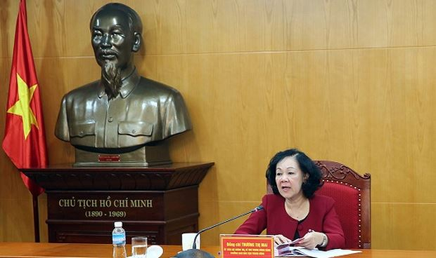 | Bà Trương Thị Mai, Trưởng ban Dân vận Trung ương,Trưởng ban Chỉ đạo Trung ương thực hiện quy chế dân chủ ở cơ sở chủ trì cuộc họp. |