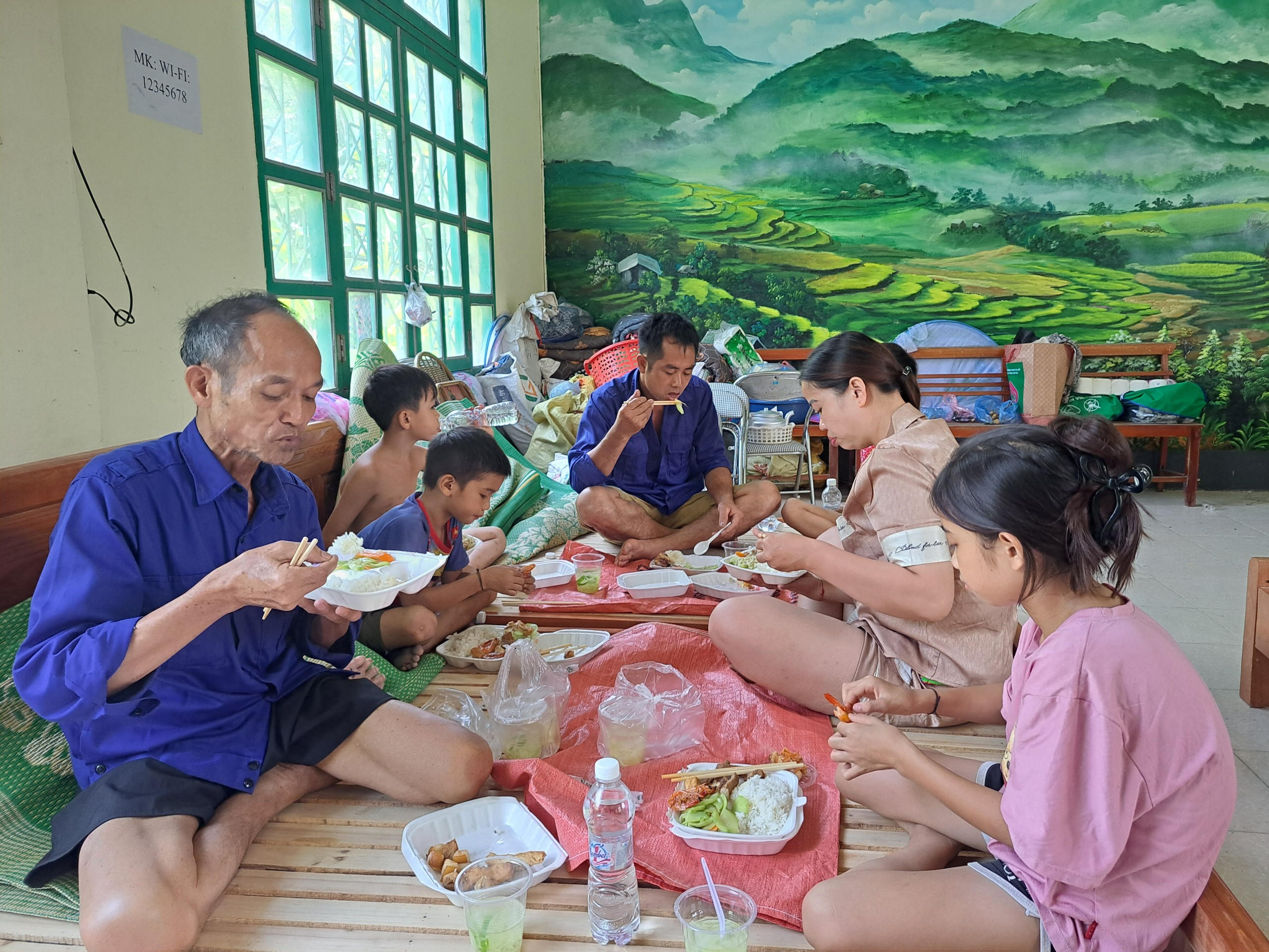 Khi sự cố xảy ra, phía Công ty đồng Tả Phời đã bố trí chỗ ăn nghỉ tại Nhà văn hóa thôn cho các hộ bị ngập lụt.