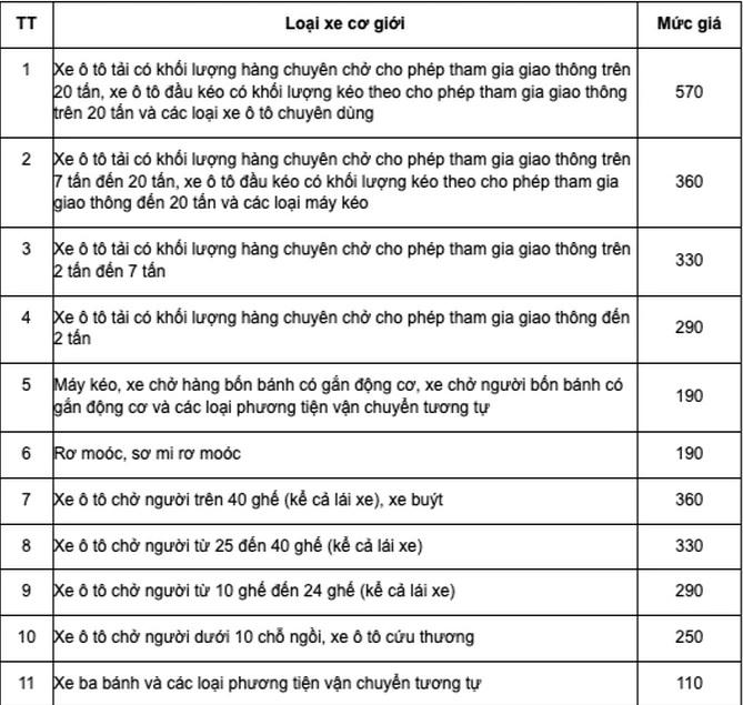 Xe ô tô chở người từ 10 ghế đến 24 ghế (kể cả lái xe), mức giá sẽ là 290.000 đồng/xe thay cho mức 280.000 đồng/xe hiện nay.