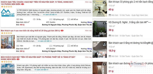 Trên một trang quảng cáo nhà đất, có tới hàng chục thông tin rao bán khách sạn ở Đà Nẵng được đưa lên trong ngày 22/2. Đơn cử, một khách sạn 4 sao trên đường Võ Nguyên Giáp có diện tích 600 m2, cao 19 tầng với 125 phòng lưu trú và 2 phòng hội nghị được rao bán giá 440 tỷ đồng.