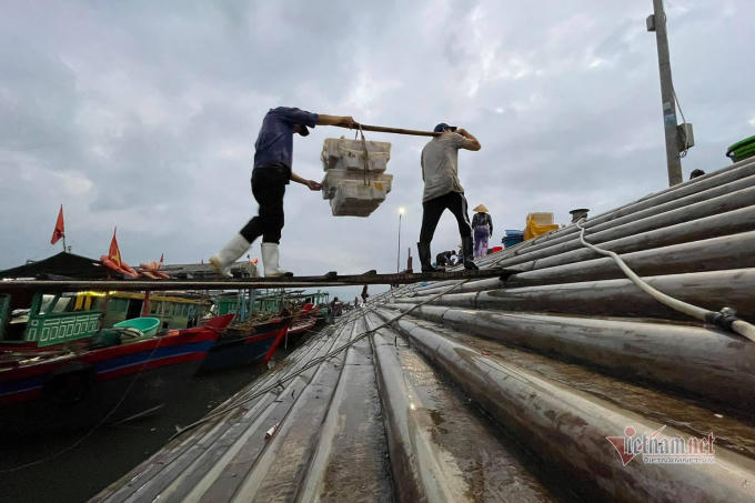 Các chủ thuyền bắt đầu công việc gánh hải sản lên bờ