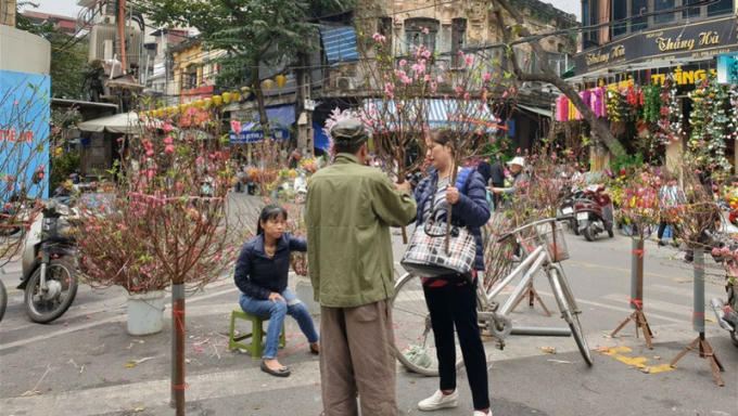 Người dân khu phố cổ mua đào trưng tết.