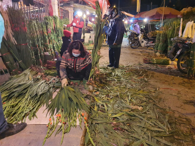 Để có hoa mang đến chợ bán, trước đó một ngày, gia đình anh đã phải cắt hoa tại ruộng rồi mang về xếp và bó lại từ tối, có khi từ chiều nếu nhiều hoa để kịp mang ra phiên chợ lúc 23h30 đêm.