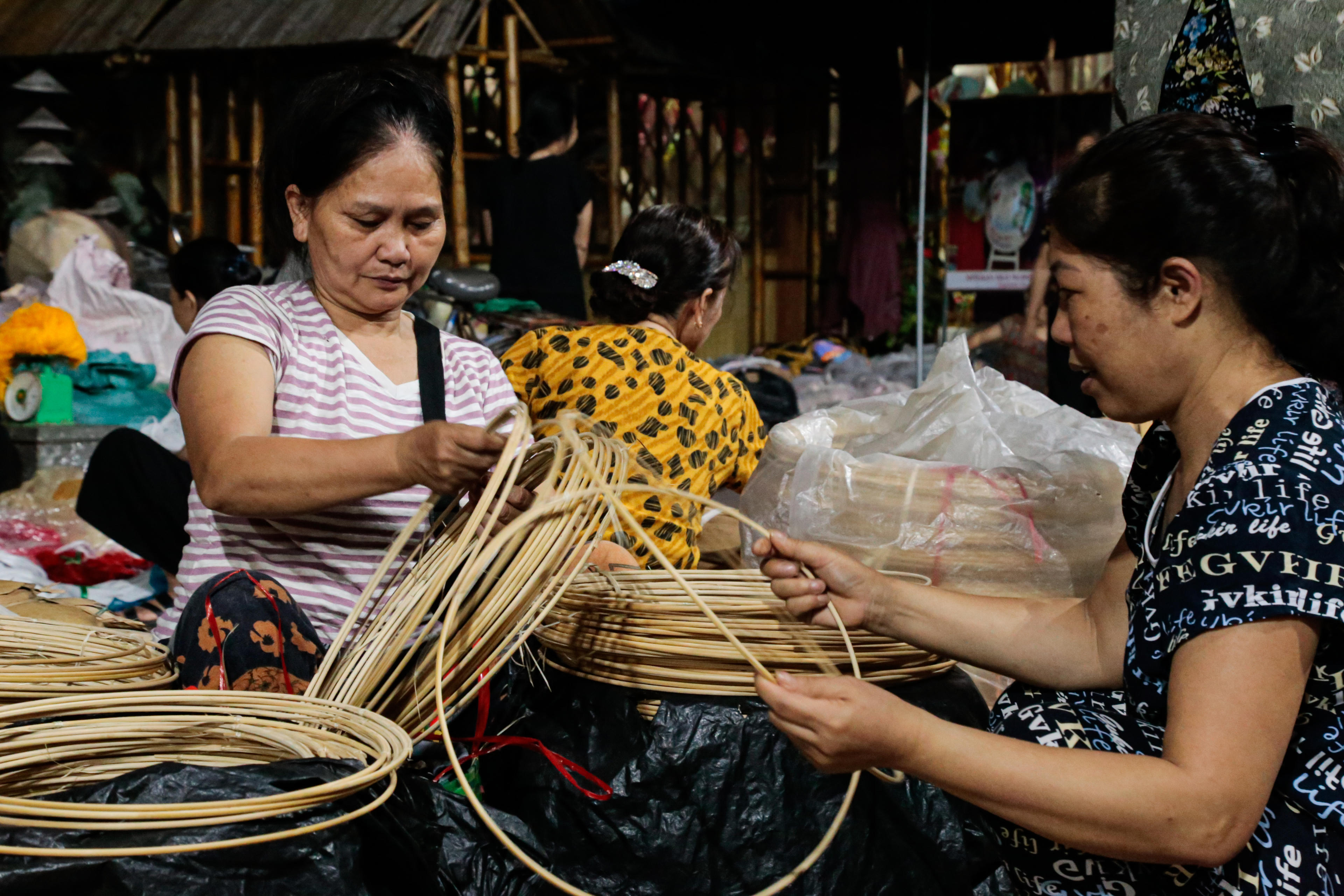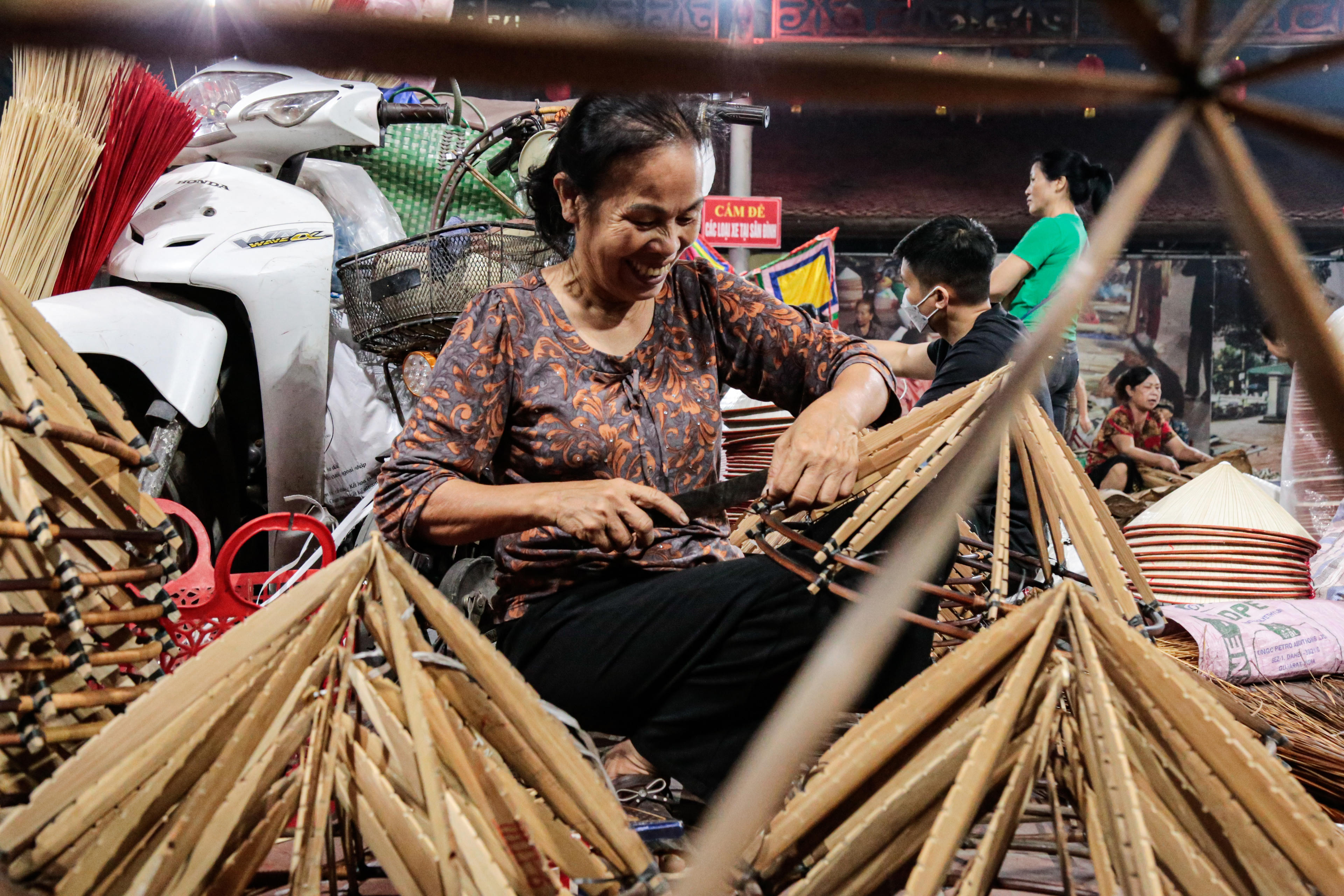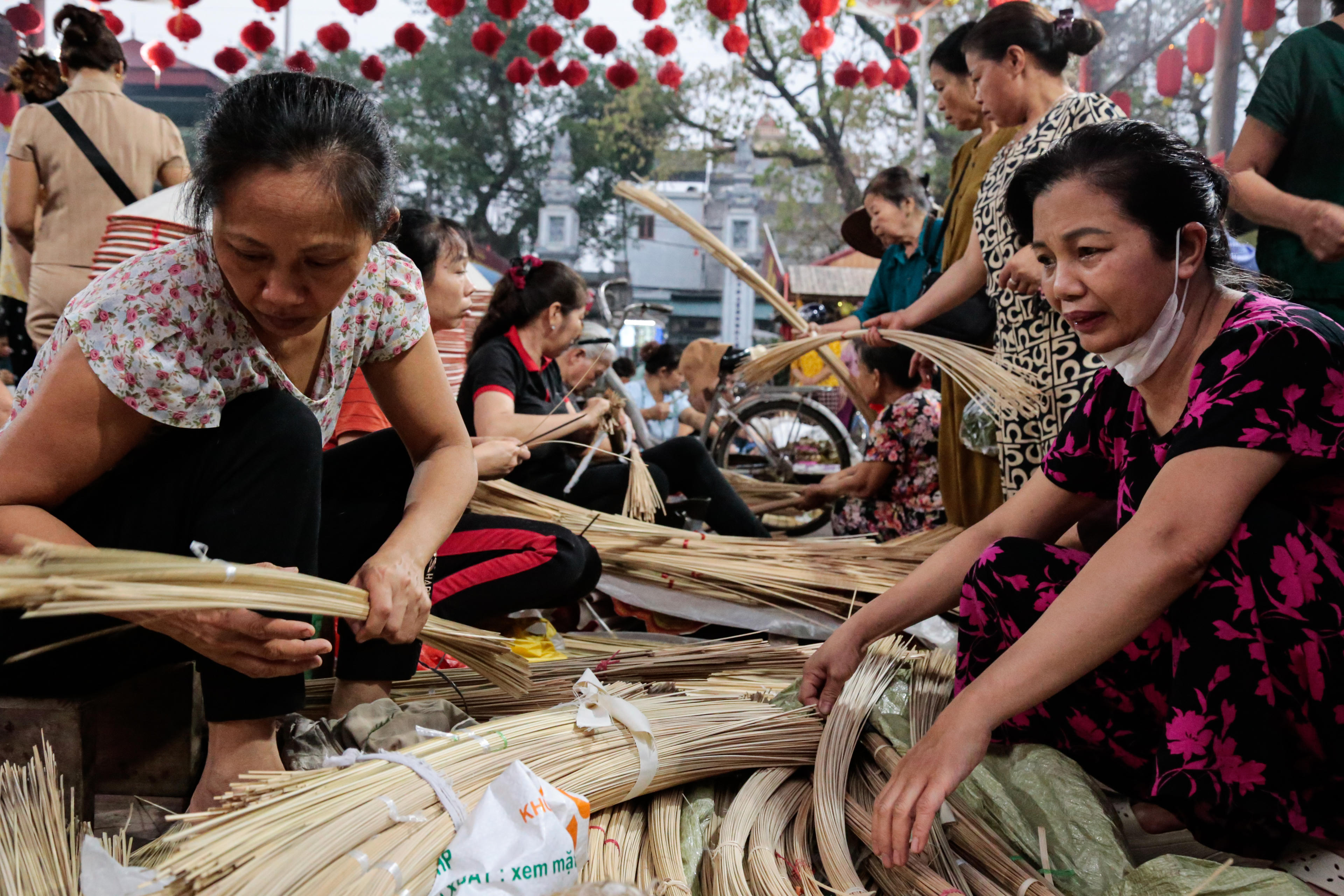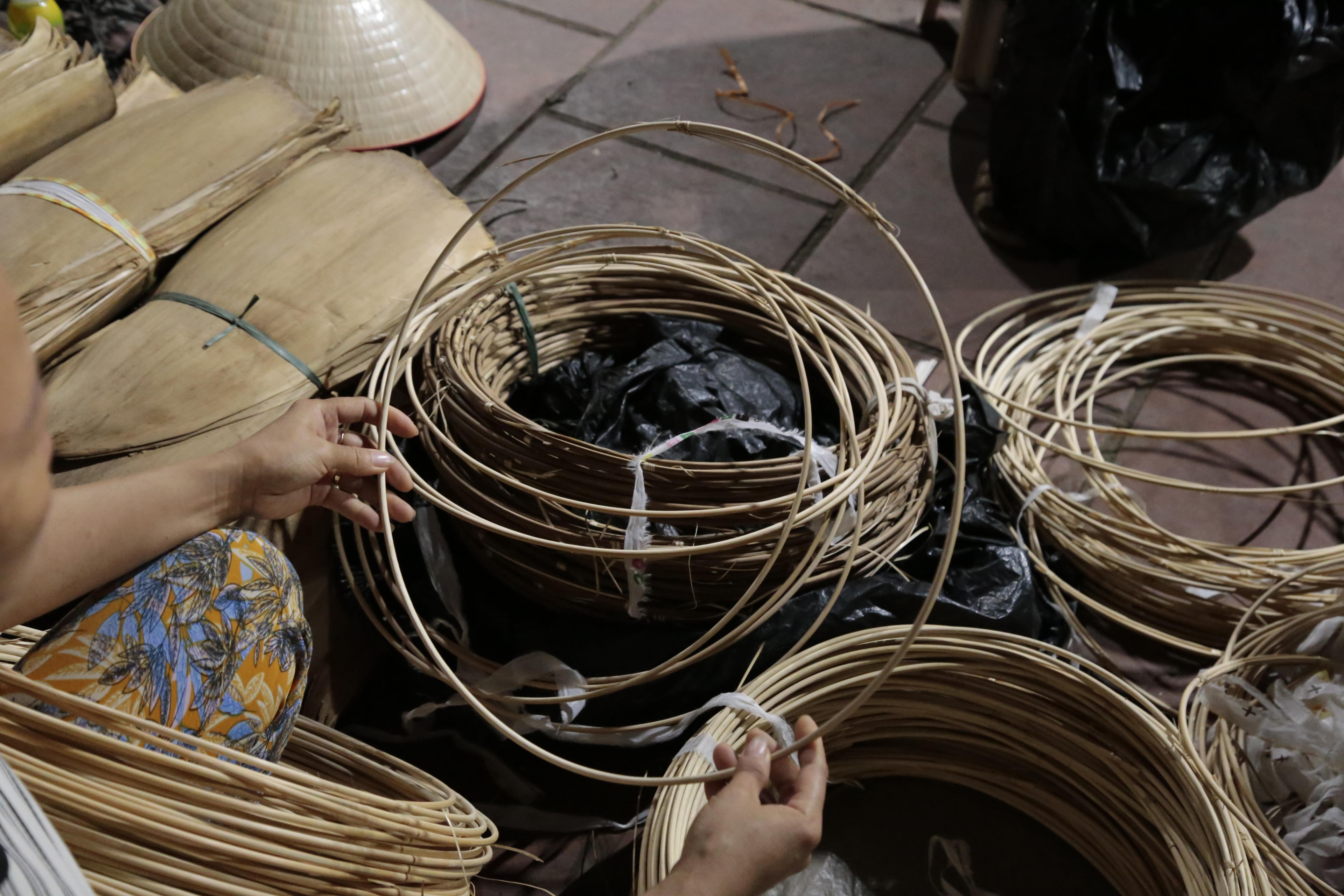 Những chiếc vành nón phải tròn, chắc, không gợn lỗi; nhiều công đoạn còn được thực hiện ngay tại phiên chợ.