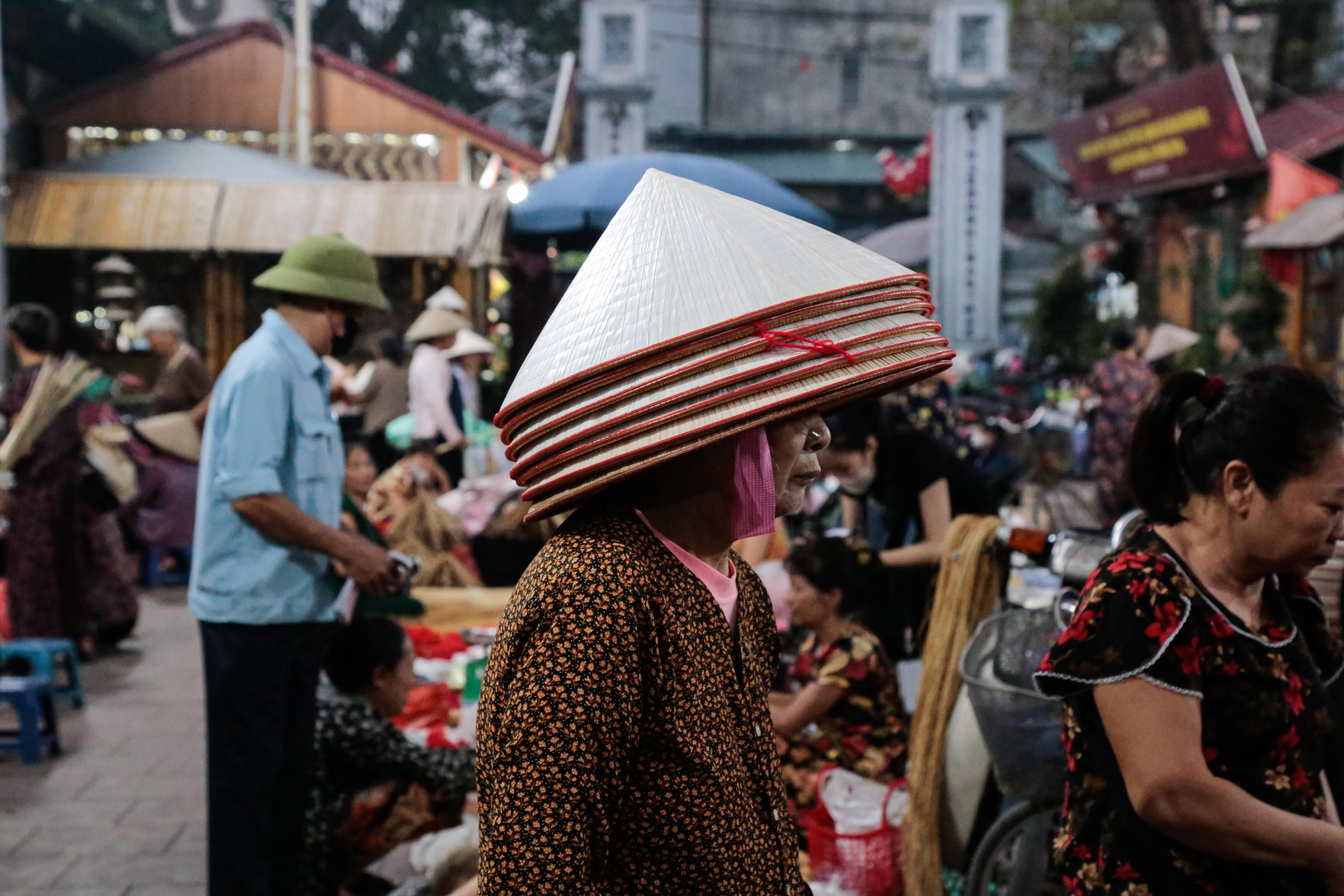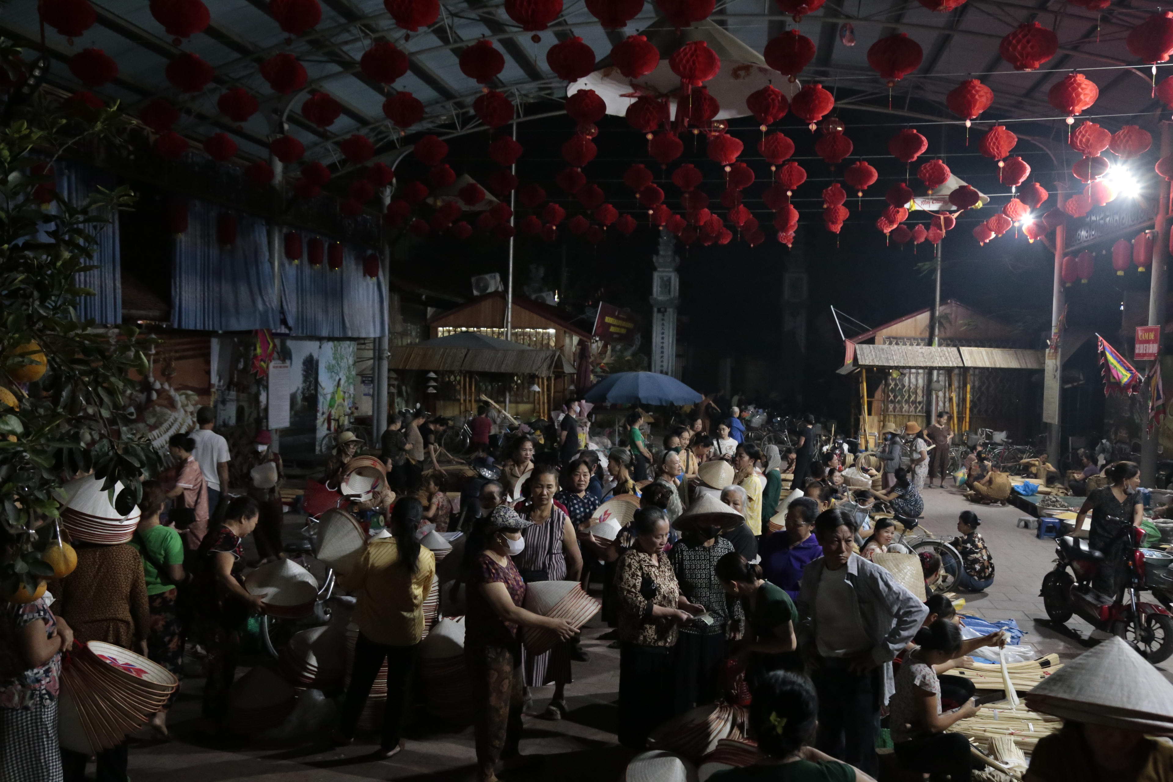 Từ khi trời còn lờ mờ sáng, người dân đã mang nón ra chợ. Những gánh hàng nối nhau, tạo nên khung cảnh nhộn nhịp nhưng vẫn giữ được nét bình dị.