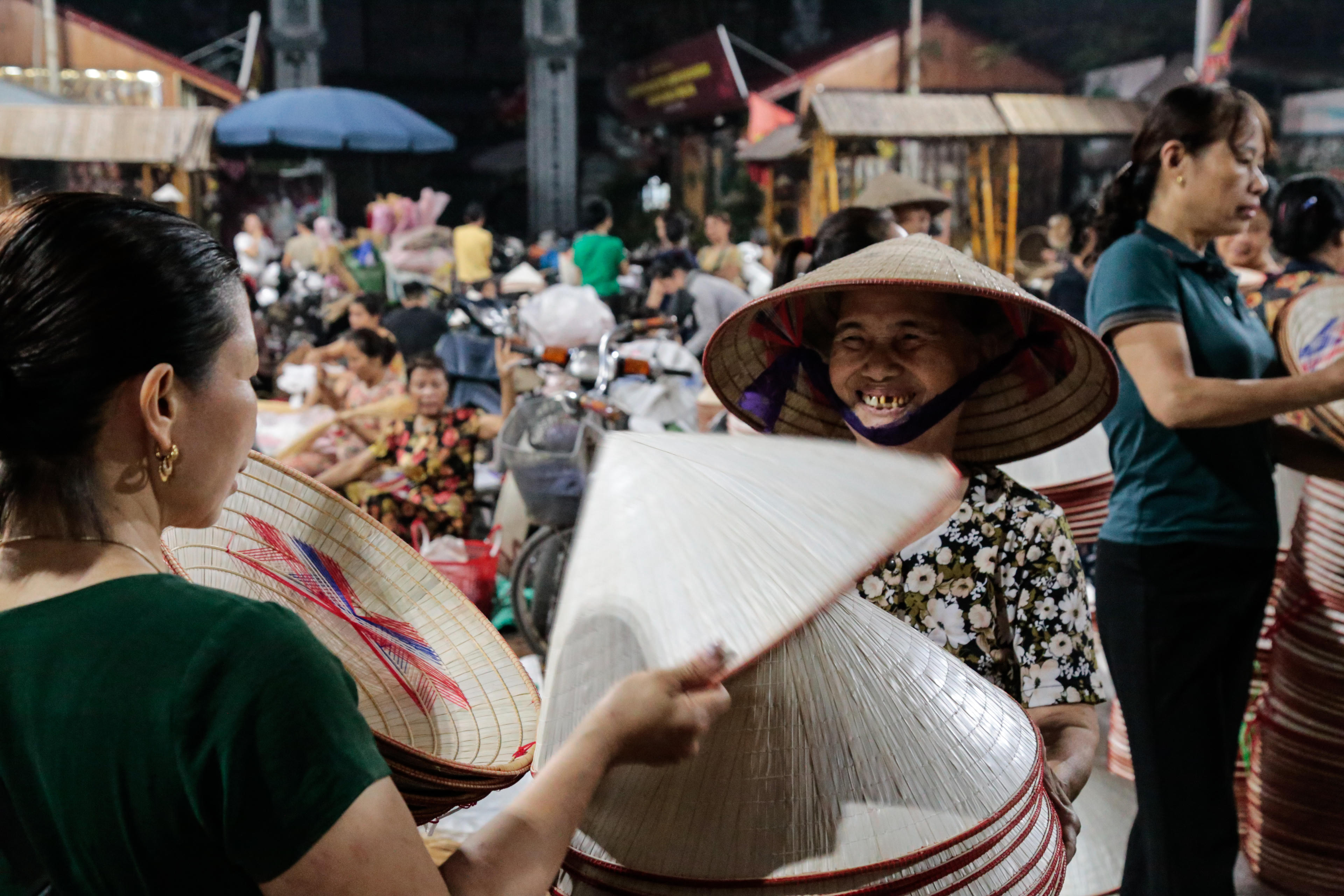 Khác với nhiều chợ phiên truyền thống người mua tìm đến người bán khác, tại đây, người bán đội trên đầu những chiếc nón đã thành hình, đi dọc quanh sân đình làng để tìm người mua.