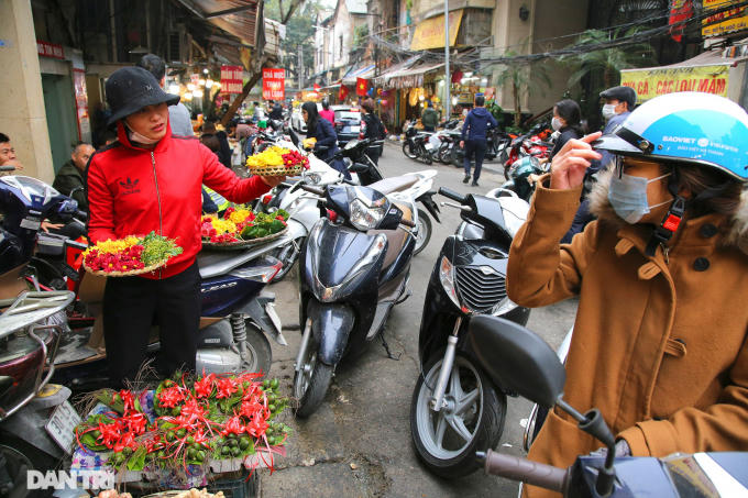 Một người bán hoa cúng theo kiểu thời xưa. Hoa chỉ có bông, được gói trong lá, sau đó người mua về bày lên đĩa dâng ban thờ. Kiểu hoa này ở Hà Nội chắc chỉ còn nơi đây là bán nhiều.