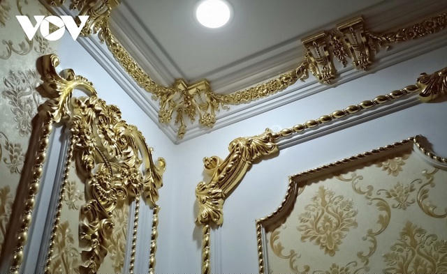 Nhìn bên ngoài, ngôi nhà có dáng dấp như biệt thự vườn, nhưng bước vào nhà, bất kỳ vị khách nào cũng phải choáng ngợp bởi các họa tiết trang trí được dát vàng 24k. Ở các góc tường, hoặc trên trần nhà đều được mạ vàng từ những lá vàng nguyên chất.