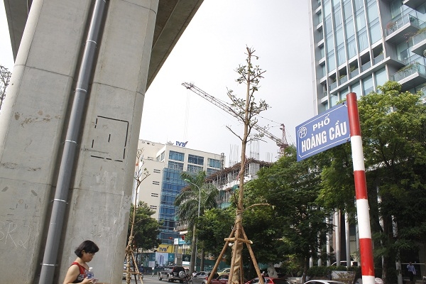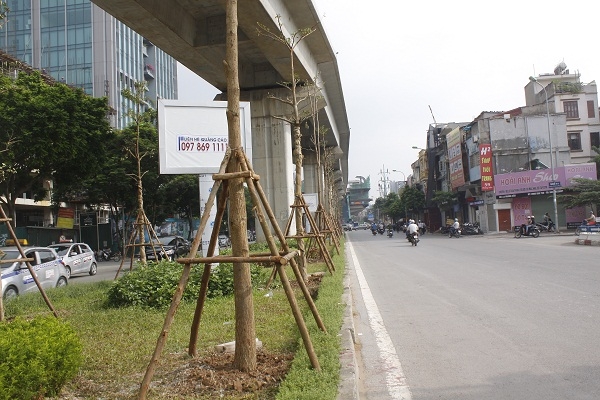 Theo ghi nhận của PV phapluatplus.vn, hiện nay tại phố Yên Lãng, Hoàng Cầu (quận Đống Đa – Hà Nội), ngay dưới gầm công trình đường sắt trên cao tuyến Cát Linh – Hà Đông đã có hàng trăm cây xanh được trồng mới, chiều cao của những cây này khoảng 7-8m, đường kính thân chừng 15-30cm.