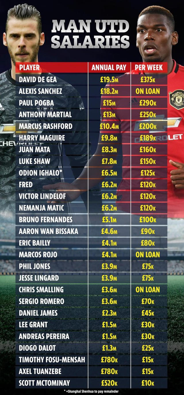 Trong khi đó, đội trưởng của Man Utd, Harry Maguire nhận lương 189.000 bảng/tuần. Tân binh Bruno Fernandes nhận mức lương khá khiêm tốn chỉ 100.000 bảng/tuần nhưng con số này hứa hẹn sẽ tăng cao nếu như tiền vệ người Bồ Đào Nha tiếp tục thi đấu xuất sắc trong chặng đường còn lại. Bản hợp đồng cho mượn Odion Ighalo cũng nhận mức lương 120.000 bảng/tuần.
