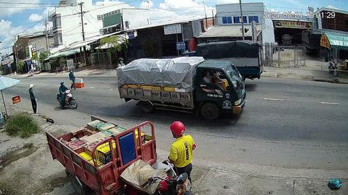 Hình ảnh ghi lại cảnh Thái Văn Thanh đu bám xe tải bỏ trốn. (Ảnh: báo Pháp luật TP HCM)