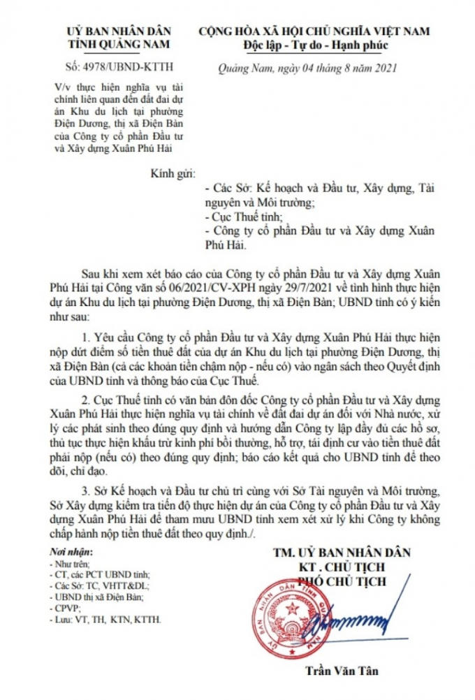 UBND Quảng Nam từng ban hành văn bản yêu cầu Công ty CP Đầu tư và Xây dựng Xuân Phú Hải thực hiện nộp dứt điểm số tiền thuê đất của dự án.