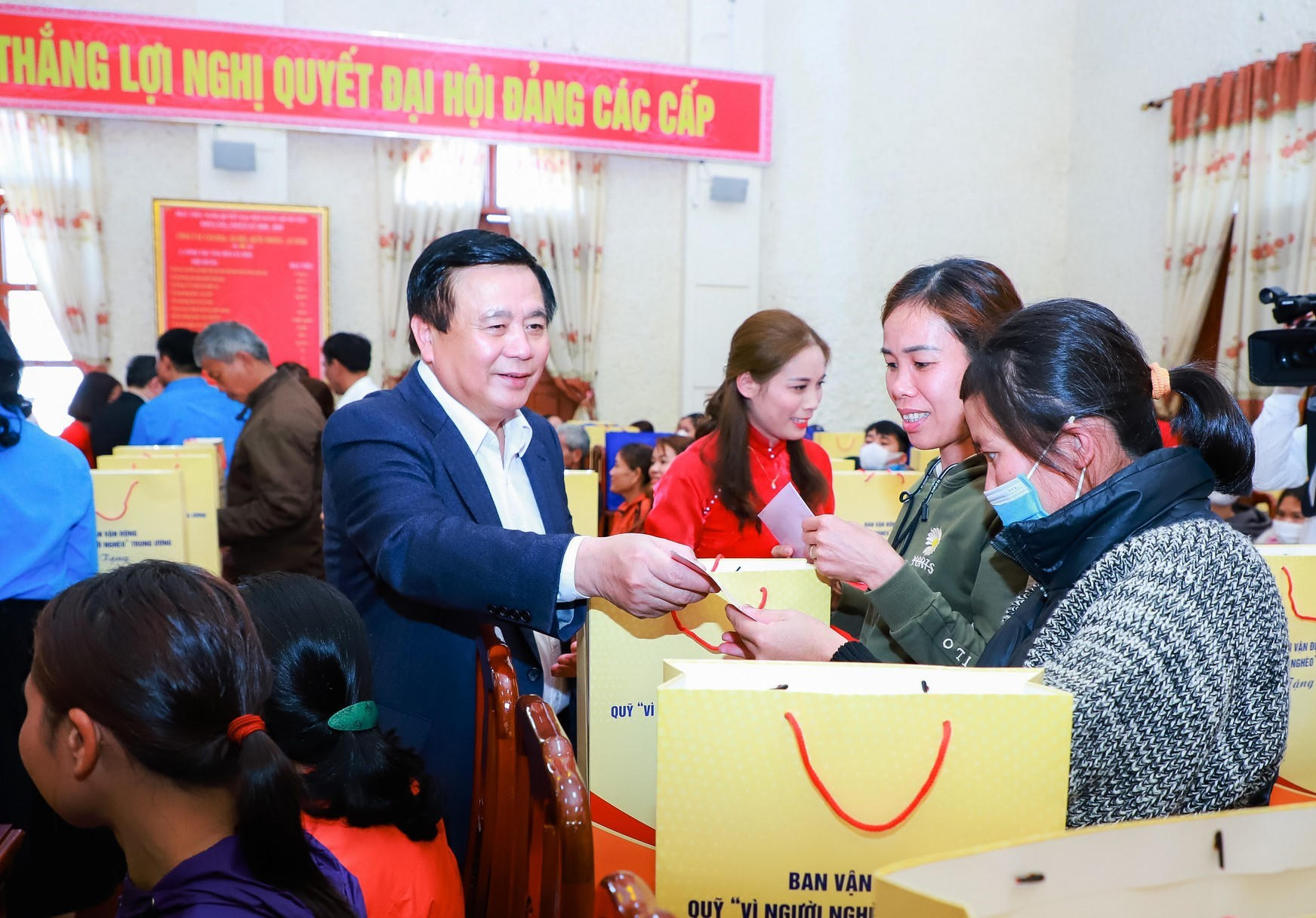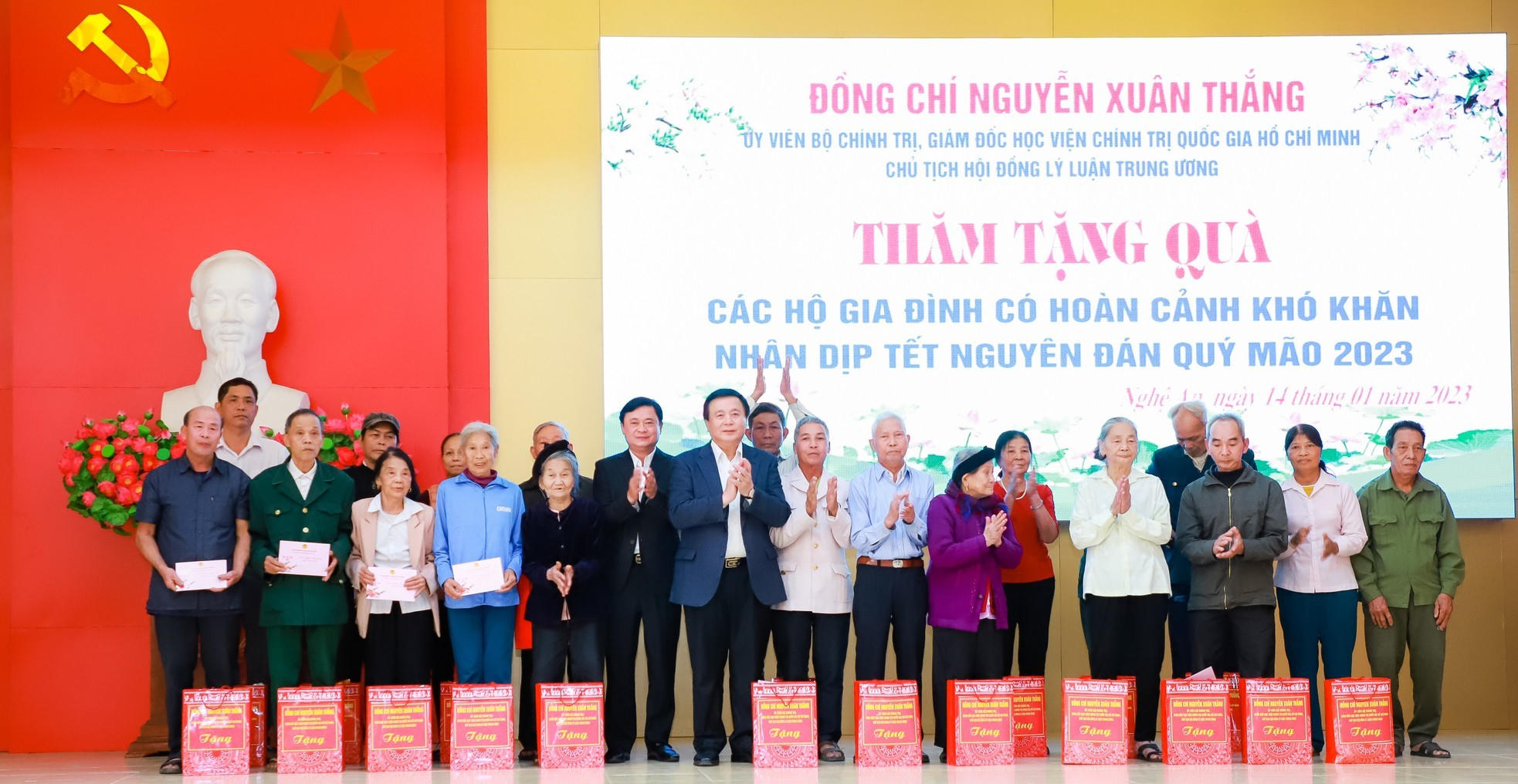 Thay mặt đoàn công tác gửi lời chúc tốt đẹp nhất đến bà con nhân dân trong những ngày đầu năm mới 2023 và chuẩn bị đón Tết nguyên đán Quý Mão, đồng chí Nguyễn Xuân Thắng khẳng định: Đảng và Nhà nước thường xuyên quan tâm đến đời sống vật chất, tinh thần của nhân dân; luôn động viên, khuyến khích bà con nỗ lực vượt mọi khó khăn và bà con Nghệ An thể hiện rất rõ tinh thần vượt khó này, đạt được rất nhiều thành quả trên mọi lĩnh vực. Đảng và Nhà nước cũng rất quan tâm, chăm lo đến các đối tượng gia đình chính sách, người có công, có hoàn cảnh khó khăn để không ai bị bỏ lại phía sau, không ai là không có Tết, để Tết là niềm vui chung của tất cả mọi người.