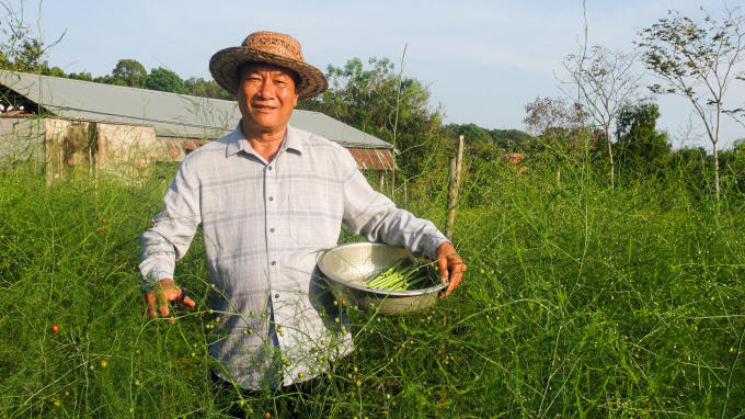 Ông Phạm Văn Hinh trong vườn măng tây xanh cho thu nhập hơn 15 triệu đồng/tháng.