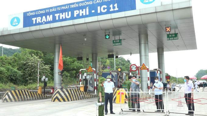 Chủ tịch UBND huyện Hạ Hoà Nguyễn Việt Dũng (áo xám thứ 3 từ phải sang) kiểm tra chốt kiểm soát dịch trên tại nút giao IC 11 cao tốc Nội Bài - Lào Cai lối xuống địa bàn huyện.