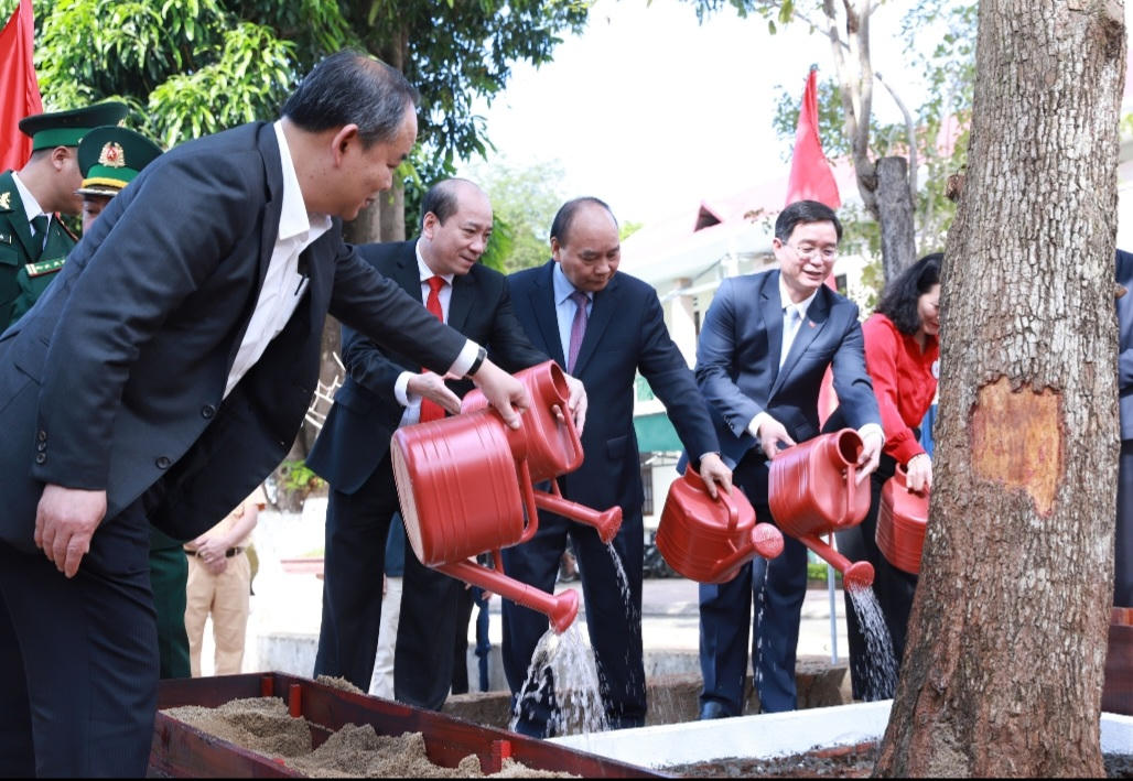 Chủ tịch nước Nguyễn Xuân Phúc, Bí thư Tỉnh ủy Đắk Lắk Nguyễn Đình Trung và các lãnh đạo tỉnh tưới cây tạo cảnh quan xanh cho khuôn viên Tỉnh ủy Đắk Lắk.