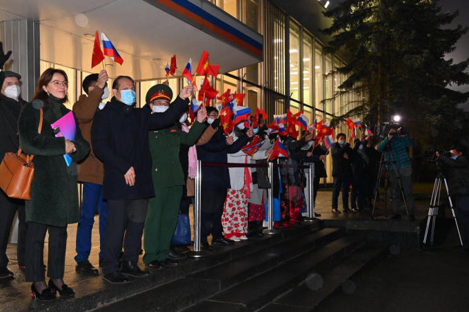 Cán bộ nhân viên Đại sứ quán Việt Nam tại Liên bang Nga và phu nhân cán bộ cơ quan ngoại giao đón Chủ tịch nước Nguyễn Xuân Phúc và Phu nhân cùng đoàn đại biểu cấp cao Việt Nam tại sân bay. (Ảnh: Nguyễn Trung từ Liên bang Nga)