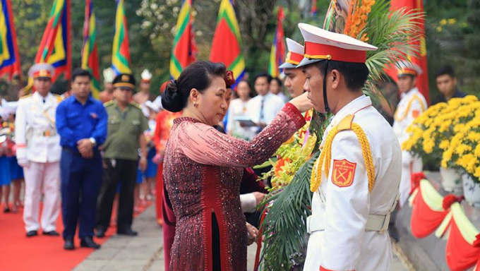 | Chủ tịch Quốc hội Nguyễn Thị Kim Ngân và đoàn đại biểu lãnh đạo Ðảng, Nhà nước, các cơ quan Trung ương, địa phương và nhân dân về dự Lễ dâng hương tại đền Giếng. |